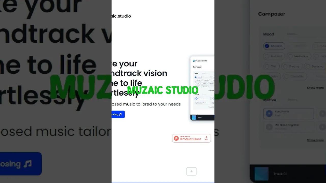 Превращайте свои видеопроекты в изображения с помощью Muzaic Studio, где музыкальная композиция, управляемая искусственным интеллектом, легко согласуется с вашим творческим видением. Начните свое путешествие с простой загрузки видео и наблюдайте, как интуитивный искусственный интеллект подбирает музыку в соответствии с настроением и стилем, которые вы ищете. Muzaic Studio воплощает вашу идею в реальность менее чем за минуту, предлагая беспрецедентный уровень удобства и скорости. Раскройте свое художественное самовыражение, определяя интенсивность, темп, тон и ритм саундтрека без типичных хлопот, связанных с производством музыки. С Muzaic Studio вы получите профессионально записанную, смикшированную и написанную искусственным интеллектом музыку не только высокого качества, но и свободную от авторских прав - уникальный и эксклюзивный саундтрек для ваших проектов. Познакомьтесь с искусством создания музыки с помощью нашей бесплатной стартовой опции и поднимите свои видео на новую высоту уже сегодня.